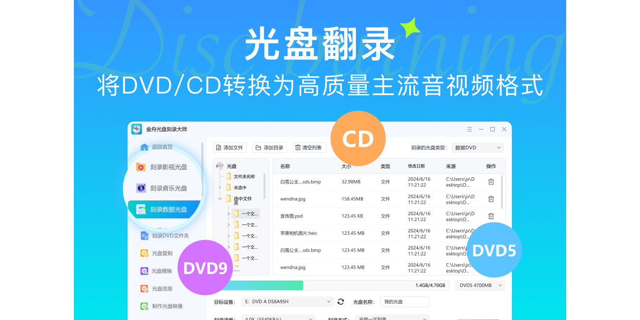 多功能性:金舟光盘刻录大师集成了多项实用功能,包括数据/影视光盘刻录、光盘复制、ISO映像文件制作/刻录、CD翻录以及音乐CD创建等。无论是备份重要资料、制作个性化的音乐或视频光盘,还是提取CD音乐或DVD音视频文件,这款软件都能轻松应对。
