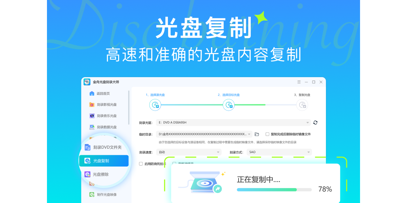 提供了一键式光盘复制功能,支持1:1精确复制现有光盘的内容到新的空白光盘上。