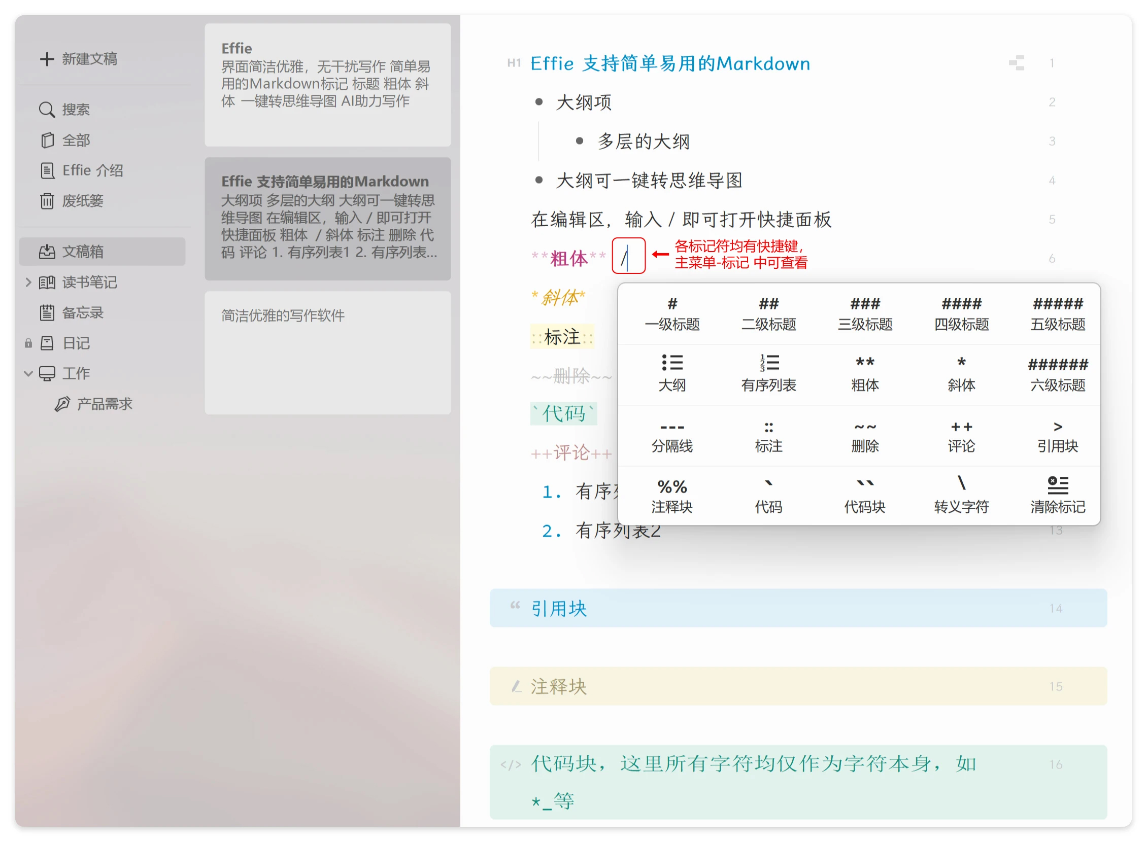 方便易用的 Markdown 标记,让你不受干扰沉浸式写作。