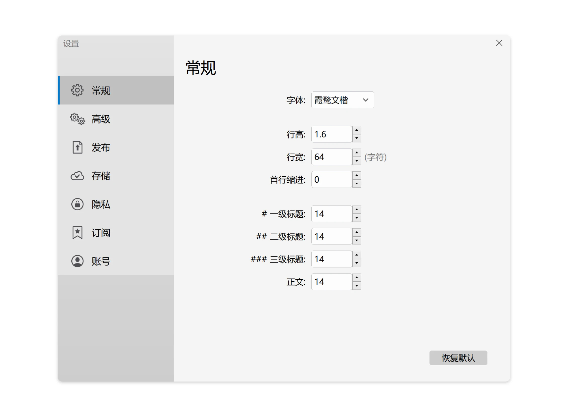 可在 常规 中设置字体、行高、行宽、缩进、字体大小等。