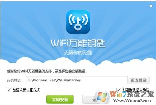 说明:用户可以点击“自定义安装”,选择更改安装路径,但自定义安装不支持中文目录,务必不要放在中文目录下,会无法正常使用WiFi万能钥匙PC版。