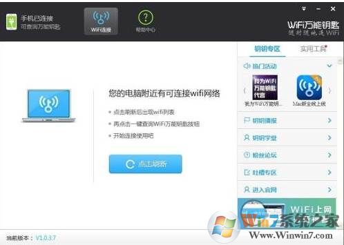 5.连上手机后,在PC界面点击“刷新”,就可以自动寻找周围可用的wifi热点啦!