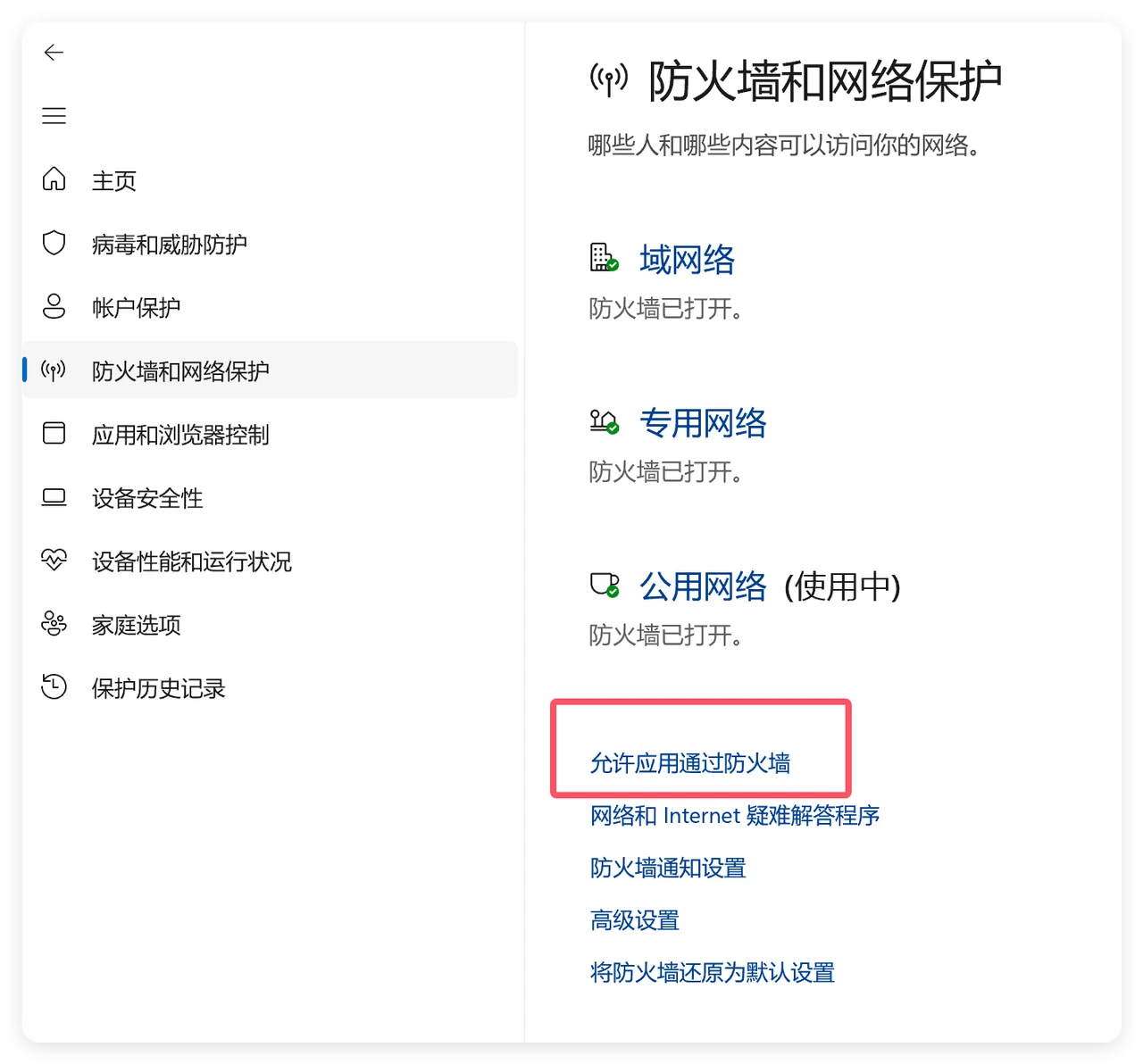1.打开 Windows 安全中心,点击“防火墙和网络保护”