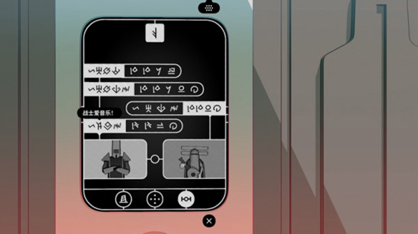 战士族的壁画,讲述的是他们乘坐帆船听从召唤来到巴别塔,听从神选之人(也就是第三层的诗人)指令,筑起城墙,把不洁之人(也就是信徒)抵挡在边境之外。战士的设定很简单粗暴,军纪严明、做事一板一眼、随时等待诗人的召唤,把守卫巴别塔当作自己的天责,当然也是不惧生死的。所有战士里有一个特殊角色,敲钟人,负责日出日落等作息的管理,嗜酒,也是其他士兵嘲笑的对象。他们的语言构造也很简单,特别之处是会把代表名词的复数词放名词前面,比如“他们”会变成“们他”。