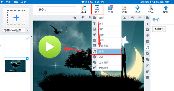 在 focusky 演示文稿里添加声音播放器十分简便,有下面两种途径: