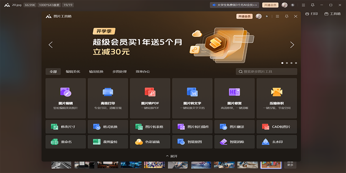 WPS图片官方版是一款永久无广告的图片处理软件,强劲图片引擎,流畅查看大图,完美兼容超 17 种图片格式。含 30 余种图片工具,智能抠图、表情包 DIY、拼图等帮助你成 p 图大师;批量处理、高级打印、无损压缩等提效职场工作,快来下载体验!