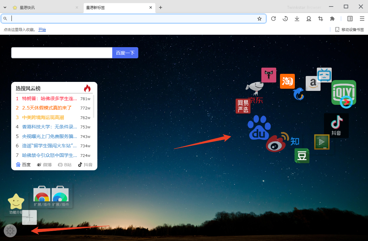 2、新标签页左下为功能区,右上含常见网站快捷方式,点击 “百度” 即可跳转至搜索页面。