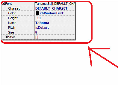 font属性也是vcl类的一个实例,字体包括字体名称、颜色和字体大小等内容。注意在属性font前面有一个加号,这表示这个属性有一些可分别设置的子属性。双击font属性名,就会扩展开来,如下图所示