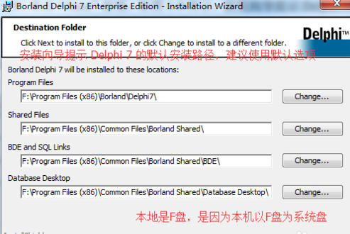 安装的过程中,安装向导提示 delphi 7 的默认安装路径,可以点击“change”按钮可以选择安装目录,也可在编辑框中直接输入,建议采用默认路径,另外,由于在卸载 delphi 7 时,会用到“安装数据库”,所以建议选择此项