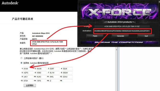 13、复制下图中的申请号,粘贴到注册上面的框,再点中间的按钮Generate,下框会生成激活码,复制到激活代码框,如下图: