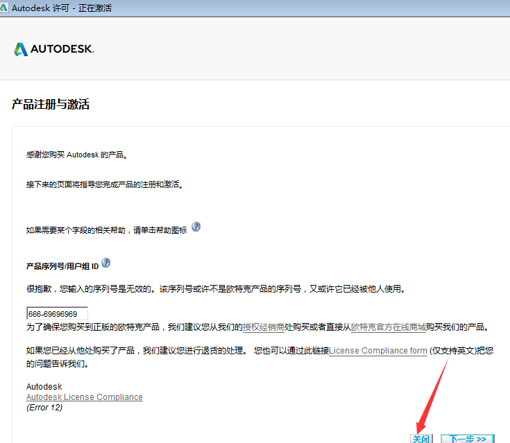 5.关闭后返回下图页面并在此点击激活,接着再次输入序列号和密钥,如图所示