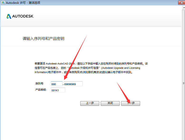 3.输入序列号和产品秘钥,666-69696969,001J1(执行这一步时必须要断开网络连接,否则会提示出错!),然后点击下一步