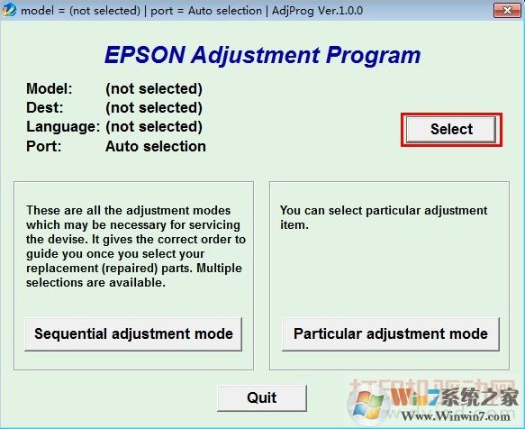 1. 运行Epson Adjprog工具主界面,点击Select按钮。选择EPSON打印机的型号,点击OK返回。