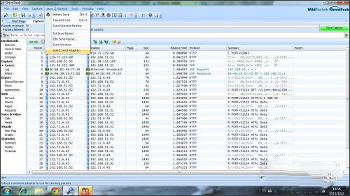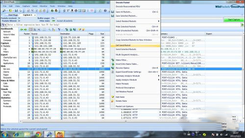 3.这里我们看到抓到了很多包,第一步,选择其中的一个数据包,右键选择set send packet,这一步是选择你要发送的包。第二步,修改包,打开send-edit send packet,进去后你可以任意修改数据包。最后点击send selected packet,发送你已经修改了的数据包给目的地。