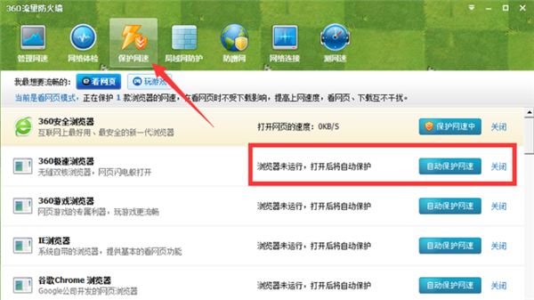 3、保护网速:针对于浏览器设置,用于看网页或者玩游戏时,保护浏览器网速。