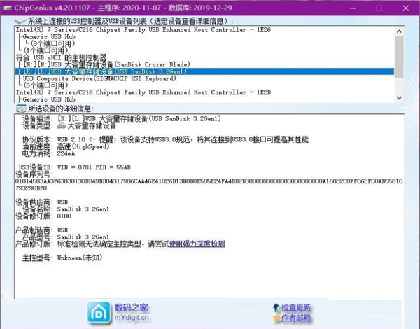 C:选择需要检测的USB设备(如U盘/MP3/MP4/摄像头/鼠标/HUB。),对新手来说这里有点复杂,不过没关系,芯片精灵会自动定位到最新插入的U盘设备,你是不是松了一口气!