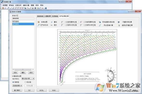 负荷计算中允许一个房间属于多个分区,并提供了系统分区的报表样式设置,能够生成窗口、TXT、EXCEL、WORD等多种计算报表,并能设置报表的打印纸张大小,还可以对系统进行焓湿图空气处理过程计算。