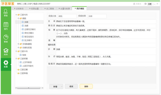 记录采用模板的方式轻松选择录入,点击牙位,即可选择处置所关联的牙位; 录入或修改处置,系统自动保存;从病历模板中导入模板,形成病历;安装格式打印病历。