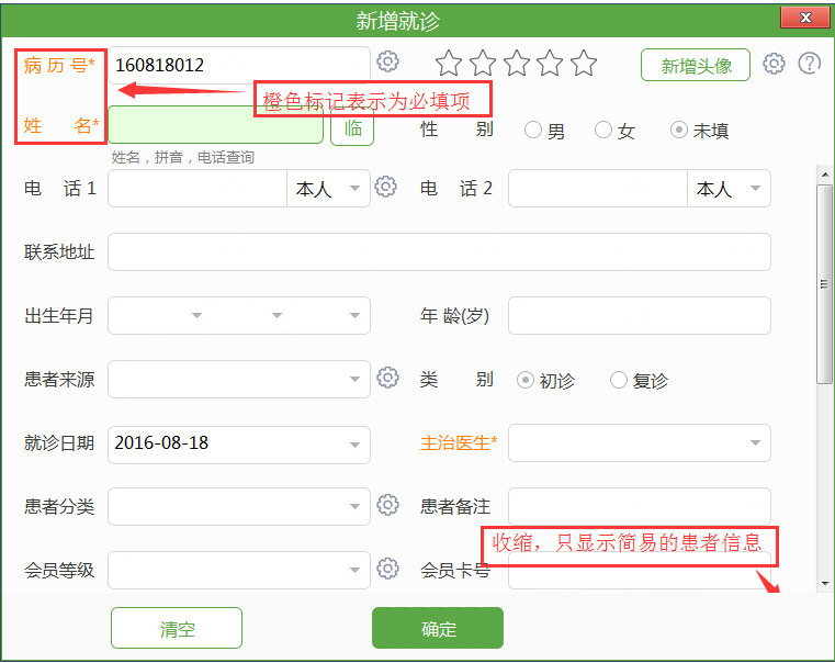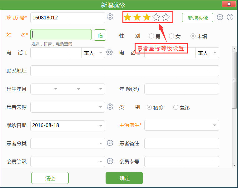 4、患者星标印象等级设置。通过设置型标可初步形成一个患者印象。例如消费水平、重要程度等;