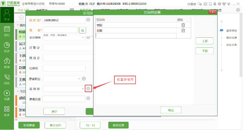 3、患者信息高级录入,录入更详细信息。可对过敏史和既往史进行自定设置。如果诊所有咨询师职位可以增加咨询师;
