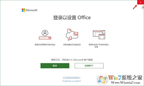 9、弹出“登陆以设置Office”界面,点击右上角的【×】关闭界面