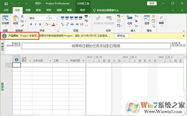 12、打开Project 2019软件,界面如下,可以看到“Project未激活”的提示,下面通过破解工具来激活Project 2019软件