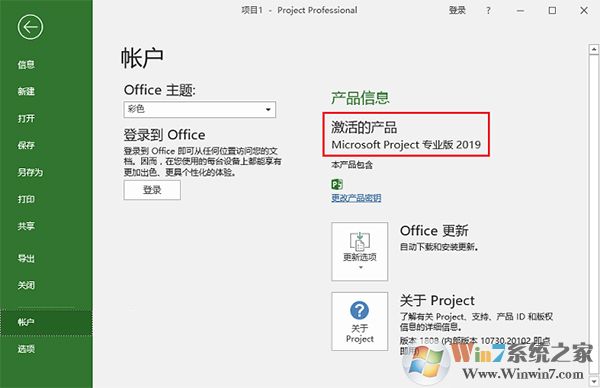 19、在“产品信息”栏可以看到“激活的产品”,下面就可以无限制使用Project 2019软件了