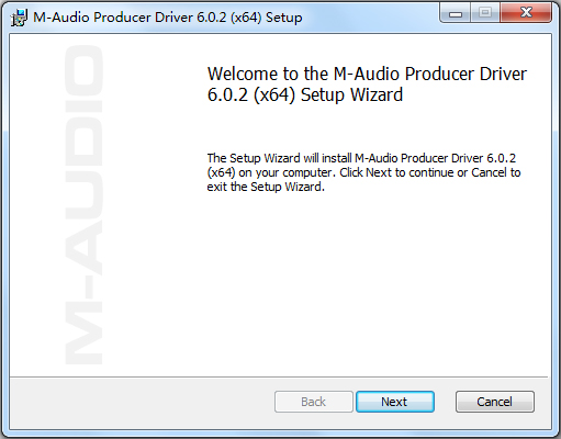 3、提示:The Setup Wizard will install M-Audio Producer Driver 6.0.2(x64) on your computer. Click Next to continue or Cancel toexit the setup Wizard.