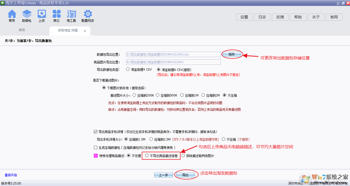 特殊商品描述处理:选择不导出商品描述信息,上传后的商品无电脑描述图,可节约大量图片空间。