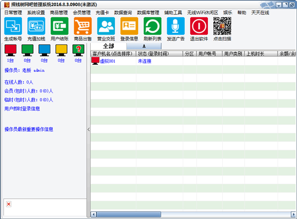 摇钱树网吧管理系统累计二十年软件开发经验、集多款网吧机房计费管理系统的精华,具有灵活多样的费率设置、强大的会员管理、商品管理详细的上机记录及冲值加钱记录等各种功能,先进的软件数据结构设计,即便网吧出现突然断电,或者服务器死机等情况,仍然可以正常计费,不影响用户使用,是大中小型网吧智能管理计费的理想选择。