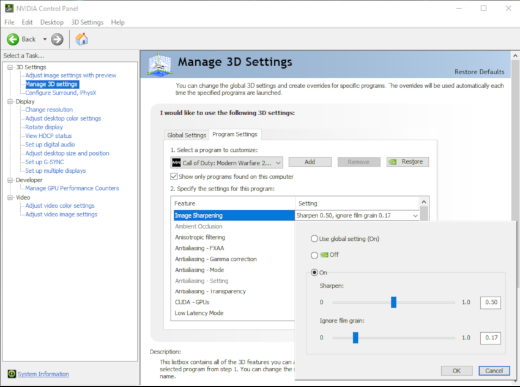 4、使用新版 GeForce Game Ready 驱动,通过默认设置开启图像锐化。
