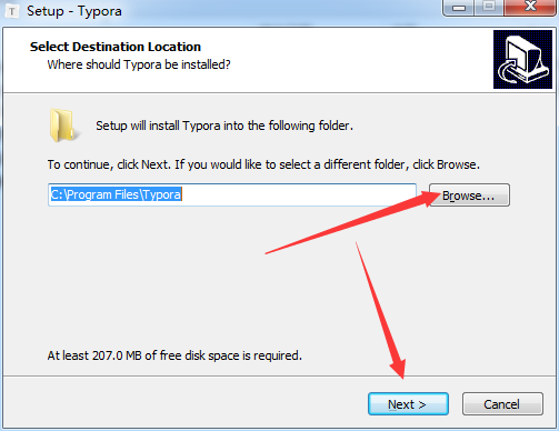 1、在本站下载软件并解压缩后,双击“typora-setup-x64-0.9.49.exe”程序,软件默认安装在C盘,大家可以点击箭头所指的“Browse”按钮选择其它盘符,小编推荐D盘,之后选择“Next”