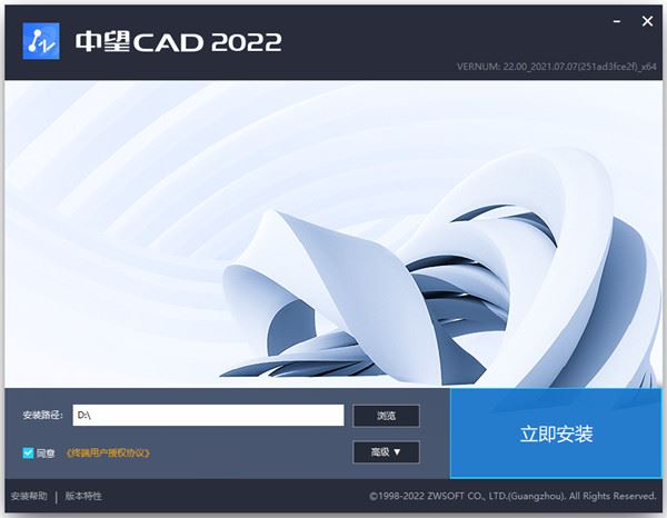 2、双击ZWCAD_2022_Chs_Win_64bit.exe,进入安装页面,勾选我同意相关许可协议,最后点击“立即安装”