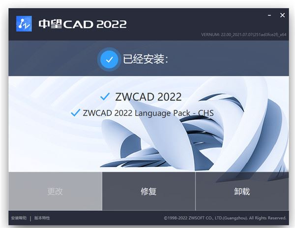 5、如果程序无法运行或者提示程序缺少dll,请再次运行数据包中的ZWCAD_2022_Chs_Win_64bit.exe安装程序,点击“修复”即可