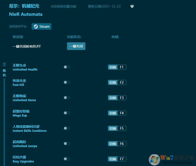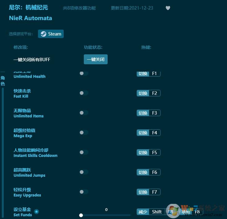 尼尔:机械纪元(NieR:Automata)》是一款由索尼与白金工作室联合制作,Square Enix发行的一款动作RPG游戏,游戏讲述了在被摧毁的地球上由人类的敌人外星人派来的机械生命体与人类方派出的人造人“尤尔哈(YoRHa)”部队进行战斗的故事。游戏背景设定在和《尼尔》相同的世界,并将有一个全新的故事剧情,但和前作几乎没有任何的关联。面对大型机械,亚当夏娃等boss的时候bgm更是让人热血激昂却又冷静透彻。战斗结束时的消失也从不显得拖沓,游戏主题曲Weight Of The World 歌曲有英语、日语、造语三个版本。歌曲最后还有非常明显的哭腔震撼人心,游戏真的是个好游戏,大家可以去下载玩一下。这里小编为大家带来的是尼尔:机械纪元八项修改器,能够帮助广大游戏玩家更快的通关,想要了解整个游戏的剧情却又因为操作问题打不过BOSS的玩家们可以来下载这个游戏辅助工具,可以让你轻松打败boss,了解整个游戏的剧情,非常适合广大新手玩家前来下载体验。喜欢的朋友欢迎来winwin7下载!