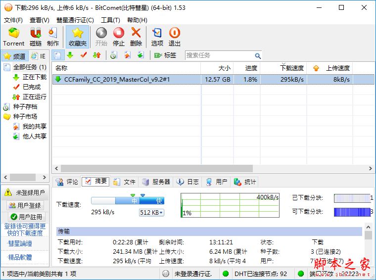 比特彗星 BitComet 绿色去广告全功能解锁豪华版进行了使用,个人感觉下载BT种子的话还没有之前发布的 Photon下载器 以及 Free Download Manager 下载的速度快,不过挂机一段时间的话比特彗星BT的下载速度会慢慢得到提升。