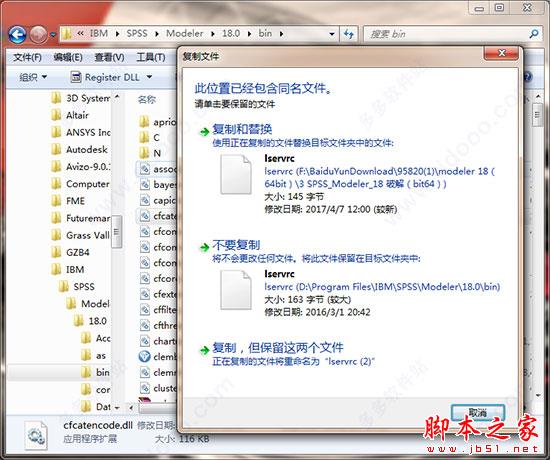 3、安装完成后,打开“”目录,将破解文件“”复制到安装目录Bin文件夹下,默认安装为C:\Program Files\IBM\SPSS\Modeler\18.0\bin,见下图所示: