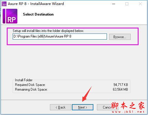 4.到这一步是选择安装的位置,默认是C盘安装,但是呢 建议大家不要装C盘,C盘是系统盘,可以装在其他盘,不然C盘软件装多了,影响系统运行速度。我这边示例的位置是安装在D盘,根目录是:D:\Program Files (x86)\Axure\Axure RP 8。 这个是我的根目录,根目录就是你的软件安装的位置简单可以这样理解。然后“Next”下一步。参考WinWin7分享的图片: