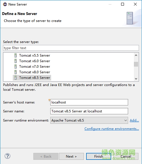 17.小编这里是8.5版本所以选择的8.5(如图),jre那个就是刚刚安装的jdk版本,点击finish