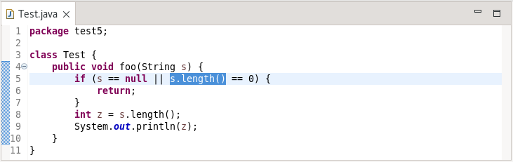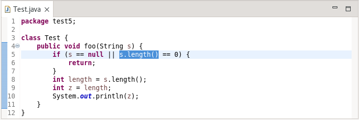 Refactor > Extract Local Variable中提供的提取局部变量重构已得到改进,可以识别添加局部变量可能导致 NullPointerException 的情况,因为它位于用于检查 null 的代码之前。在这些情况下,局部变量的定位被改变,因此空值检查发生在变量声明之前。例如,在下面的类中,在验证 String 变量不为 null 之后调用 String length () 方法。