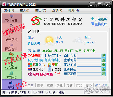 ·常用工具功能,系统嵌入常用工具集,提供屏幕颜色、温度、万年历、搜索引擎、IP查看、手机号码查看、英汉翻译等常用工具,满足用户的多样化需求。