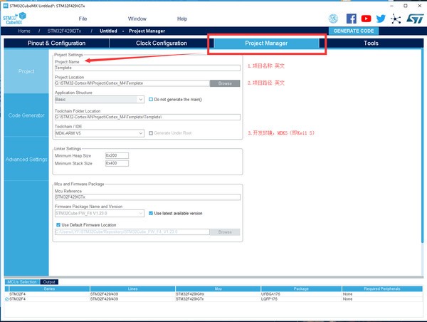 输入工程名,选择工程路径(注意不要出现中文,否则可能出错)。工具链/IDE选择MDK-ARM V5。最后面可以设置堆栈大小,此处默认不作修改。