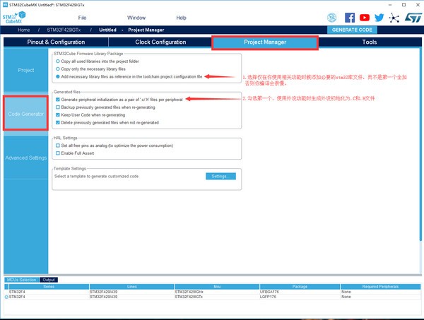 在Code Generator中找到Generated files框,勾选Generated periphera initialization as a pair of ‘.c/.h‘ files per IP。外设初始化为独立的C文件和头文件。