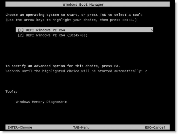 UEFI模式的启动菜单:(UEFI模式一般使用微软的BootMgr控制启动,无法做的更丰富)