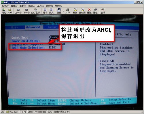 2、重新启动,修改BIOS下SATA工作模式为AHCI选项,以下修改硬盘模式方法为“AHCI”,有些则为Enabled或Disabled(不同机型BIOS中硬盘模式修改位置及方法略有差别)