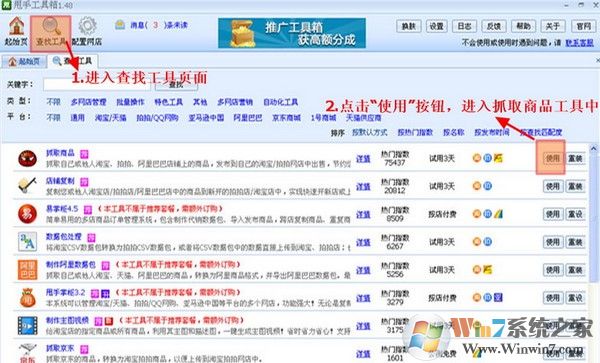在甩手工具箱查找工具页面找到抓取商品工具,点击后面的立即使用,会进入抓取商品工具中